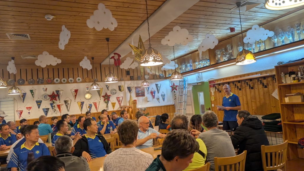 22 Doppel, also 44 Spielerinnen und Spieler, hatten sich für unser Weihnachtsdoppelturnier am Samstag 13.12.2025 angemeldet und alle waren gespannt, frohgemut und pünktlich um 11 Uhr zur Begrüßung in der Kegelbahn.