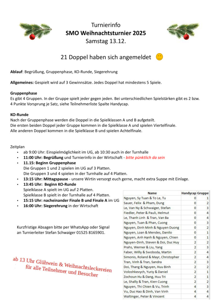 Zum Weihnachtsturnier am 17.12.022 meldeten sich sage und schreibe 40 Teilnehmer an.